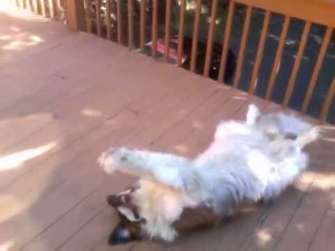 Emma the St. Bernard defiantly rolls over onto her back and waves her paws in the air when her human asks her to come inside.