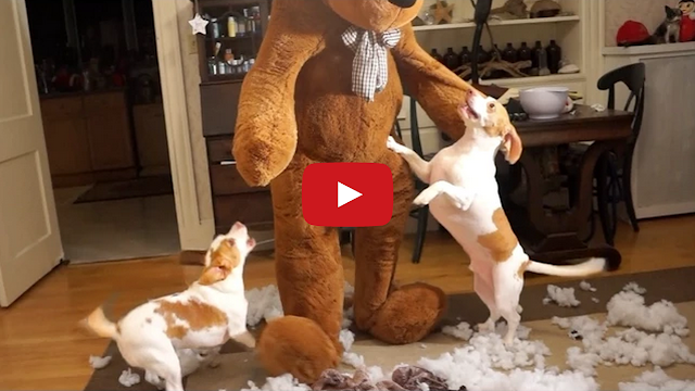 Beagle siblings Maymo and Penny love to de-stuff their teddy bears, and had a blast making a huge mess and playing in the stuffing. Little did they know they would receive a visit from a gigantic life-size teddy bear. Thankfully Maymo is pretty fearless and immediately wrestled the bear to the ground, but unfortunately for him this bear didn’t come with any stuffing.