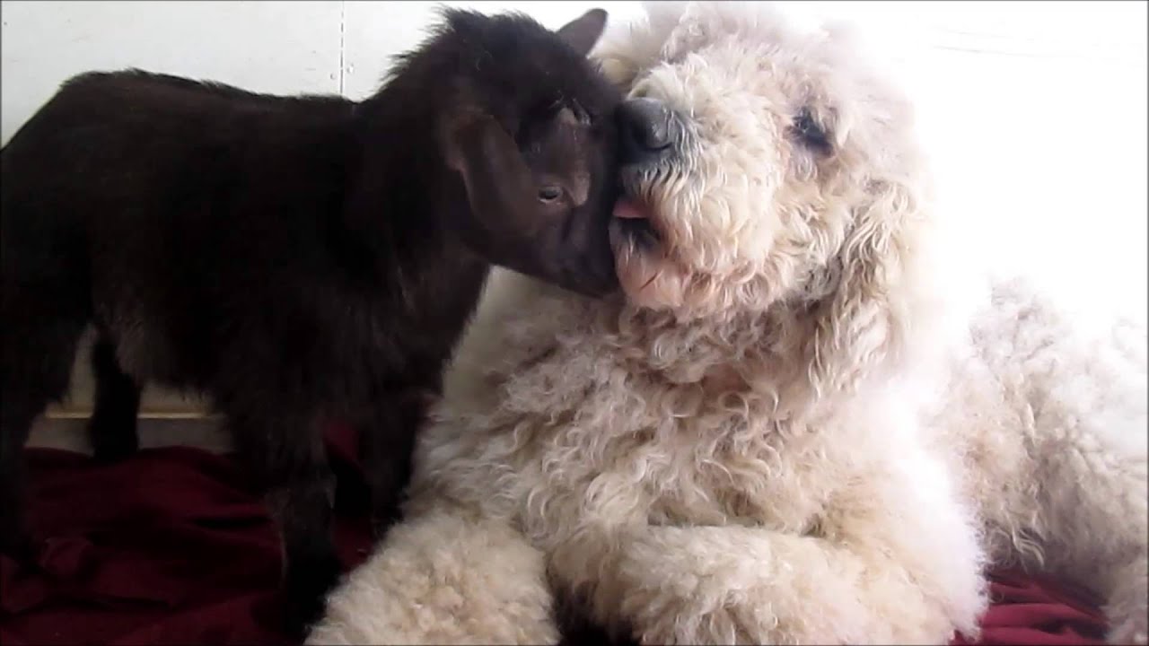Peppa Lass the baby Nigerian Dwarf goat loves to play, jump on, and cuddle with her gentle canine housemate, Duchess the Komondor dog.