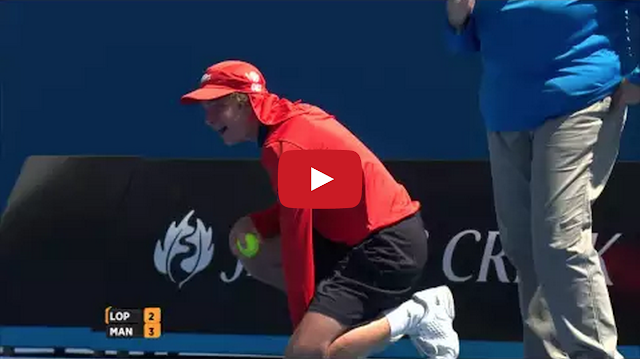 An unfortunate ball kid at the Australian Open tennis tournament gets hit in the groin area by a fast-moving serve from Spanish tennis pro Feliciano Lopez.