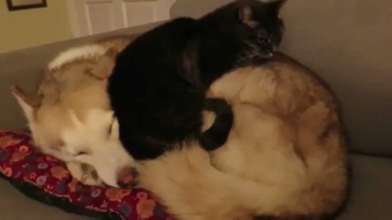 Cat Turns Sleeping Husky Dog Into Cozy Cat Bed