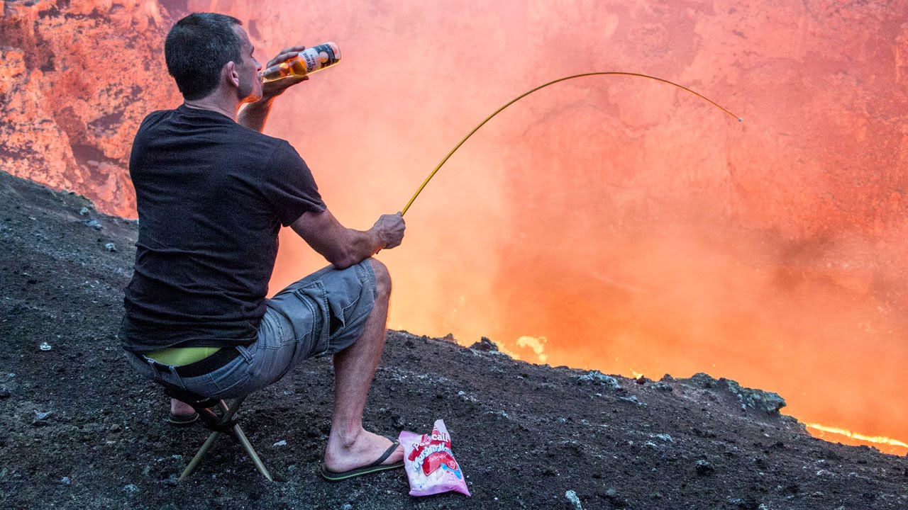 Crazy Guy Roasts Marshmallows Over an Active Volcano ByTastefully Offensive January 11, 2015 Simon Turner, a lunatic daredevil from Christchurch, New Zealand used a spare tent peg to roast marshmallows over a lava lake inside Marcum Crater in Ambrym, Vanuatu. [caterstv/via neatorama]