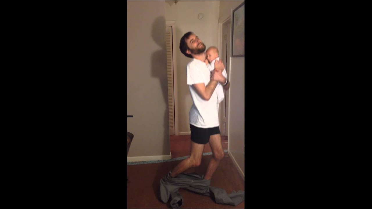 Dad Attempts to Put on Pants While Holding His Newborn Baby