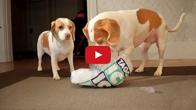 “One of Maymo’s favorite things to play with/eat is ice, so when presented with a whole bag of ice chips, the funny dog has a hilariously adorable meltdown. Watch cute beagle Maymo run back and forth past his sister as he plays with the ice, not able to control his excitement.”