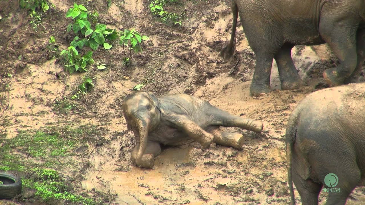 After a rainy day, the rescued elephants from Elephant Nature Park in Chiang Mai, Thailand, turned a slippery mudbank into a fun slide.