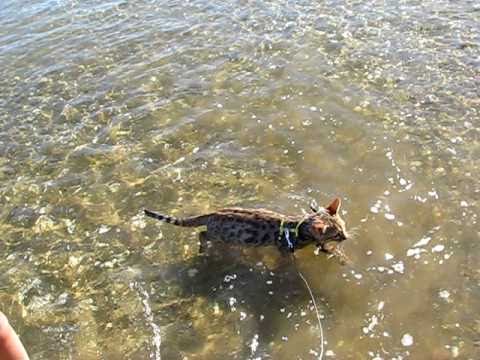 A dad and daughter get really excited when their bengal kitten Diego decides to go for his first swim while they’re visiting Graham’s Beach in Awhitu Peninsula, Auckland, New Zealand.