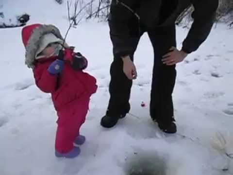 2-year-old Bethany struggles to reel in her first fish, a rainbow trout, while ice fishing with her parents on a lake in remote Alaska.