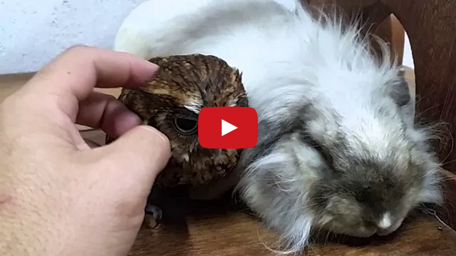 Best buds Forbi the owl and Manu the bunny slowly start to fall asleep together while getting head scratches from their human.