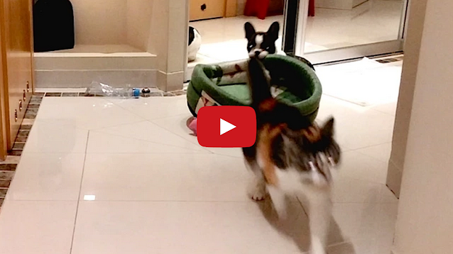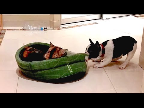Pixel, an adorable 10-week-old French bulldog puppy, reclaims ownership of his dog bed that his bully cat housemate keeps stealing from him.