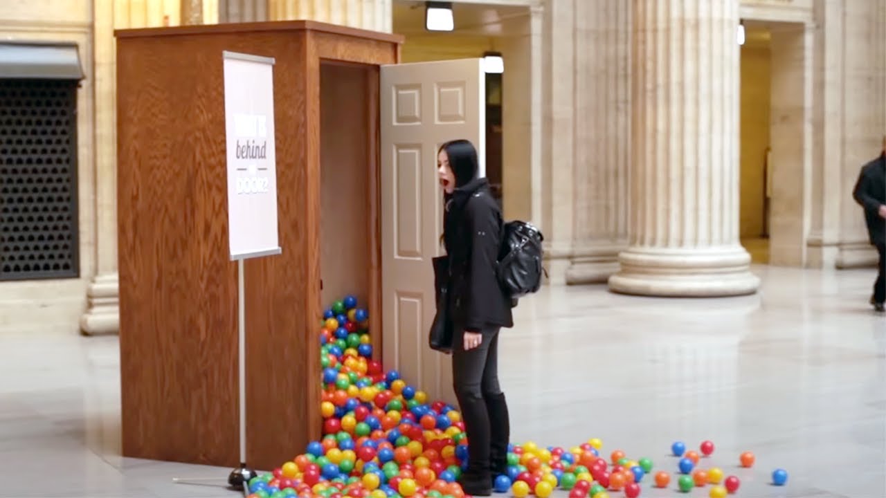 YouTuber Blake Grigsby secretly set up a small closet filled with 2000 ball pit balls in the middle of Chicago Union Station’s Great Hall, then filmed people’s reactions when they were curious enough to open the closet’s door.