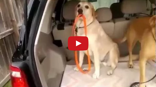 While getting ready to go to the dog park, Baxter helps his brother Pluto pull his leash into the car so their human, Jason Ephraim, can close the trunk door.