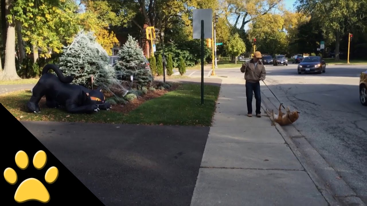 While out on a peaceful walk with his human, this poor dog gets taken by surprise by a creepy black cat Halloween decoration.
