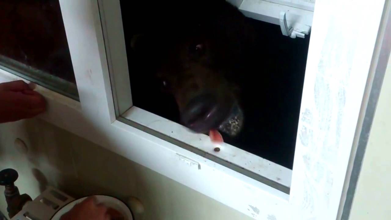 A brown bear uses his huge paw to grab snacks from a Russian man who appears to be running a drive-through fast-food restaurant for hungry wild animals.