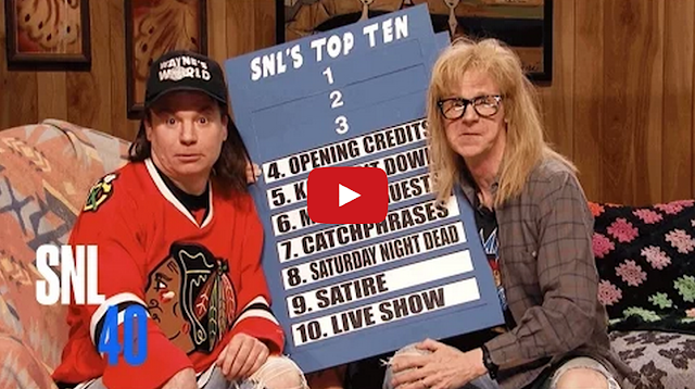 SNL 40th Anniversary Special: Wayne’s World by Tastefully Offensive Wayne (Mike Myers) and Garth (Dana Carvey) list their top ten favorite things about SNL. [saturday night live]