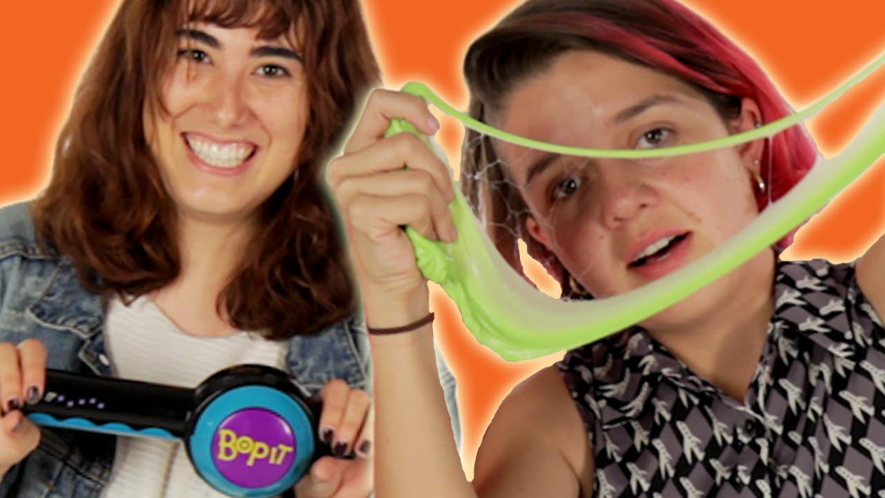 A group of adults test out and review classic toys from their childhood including, Bop It, Hit Clips, Tamagotchis, Skip It, Gak, and Moon Shoes.