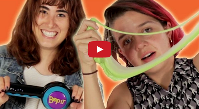 A group of adults test out and review classic toys from their childhood including, Bop It, Hit Clips, Tamagotchis, Skip It, Gak, and Moon Shoes.