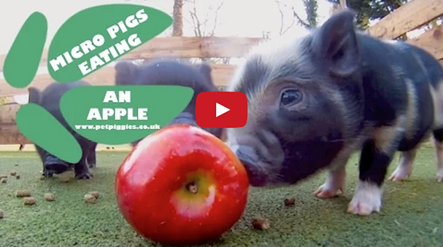 Four adorable 6-week-old micro piglets from Petpiggies in Ridgmont, Bedfordshire, U.K., take turns munching on an apple that’s bigger than their heads.