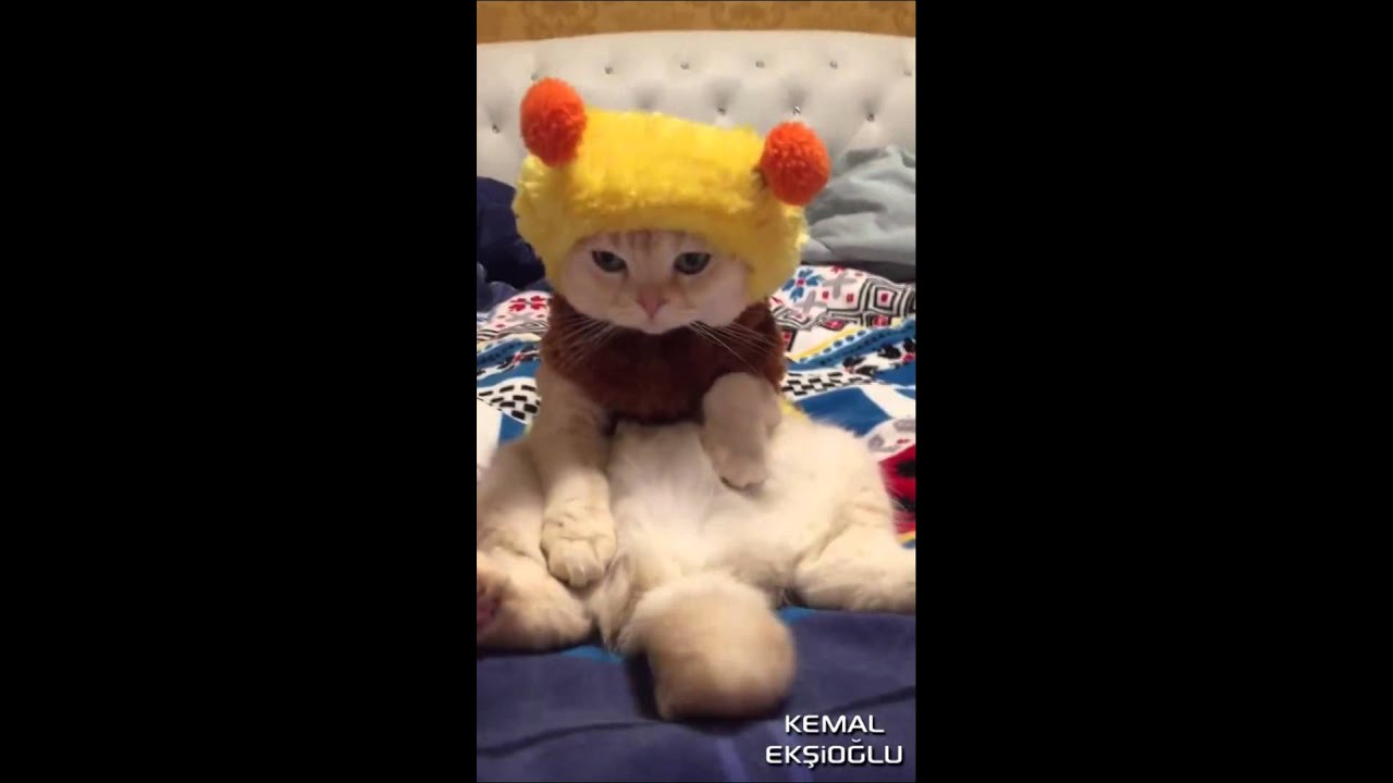A cute cat in a bee costume watches television while sitting up on a bed like a little kid.