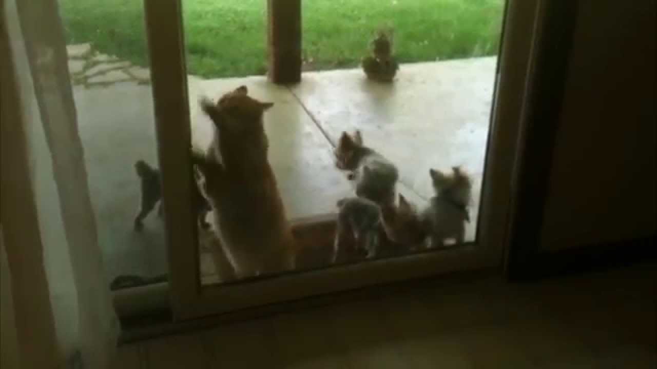 Buster the cat takes matters into his own paws when he and his four Yorkshire terrier siblings are ready to come inside the house.
