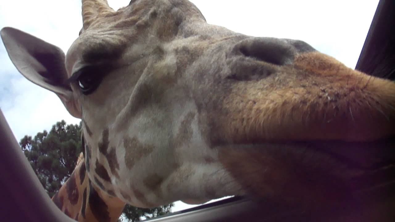 While visiting a drive-through safari park, Dawn O’Hara and her family had a very close encounter with a friendly giraffe who stuck his head completely in their car and helped himself to a big bag of snacks.
