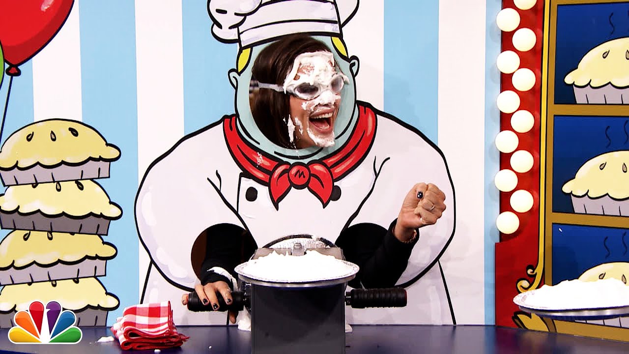 Actress Jennifer Garner and Tonight Show host Jimmy Fallon play an intense game of “Rock, Paper, Scissors” where the loser of each round risks getting hit in the face with a pie.