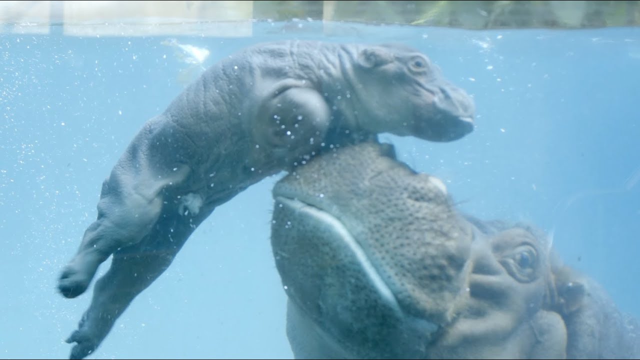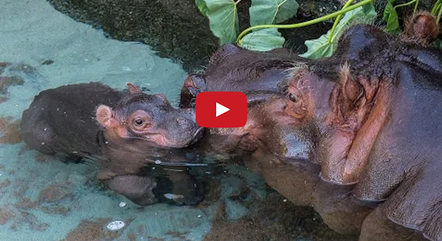 This adorable baby hippopotamus was born early last week at the San Diego Zoo and was just 3-days-old when this video was taken. The mother hippo, Funani, gives nudges of encouragement as the calf learns to navigate underwater.