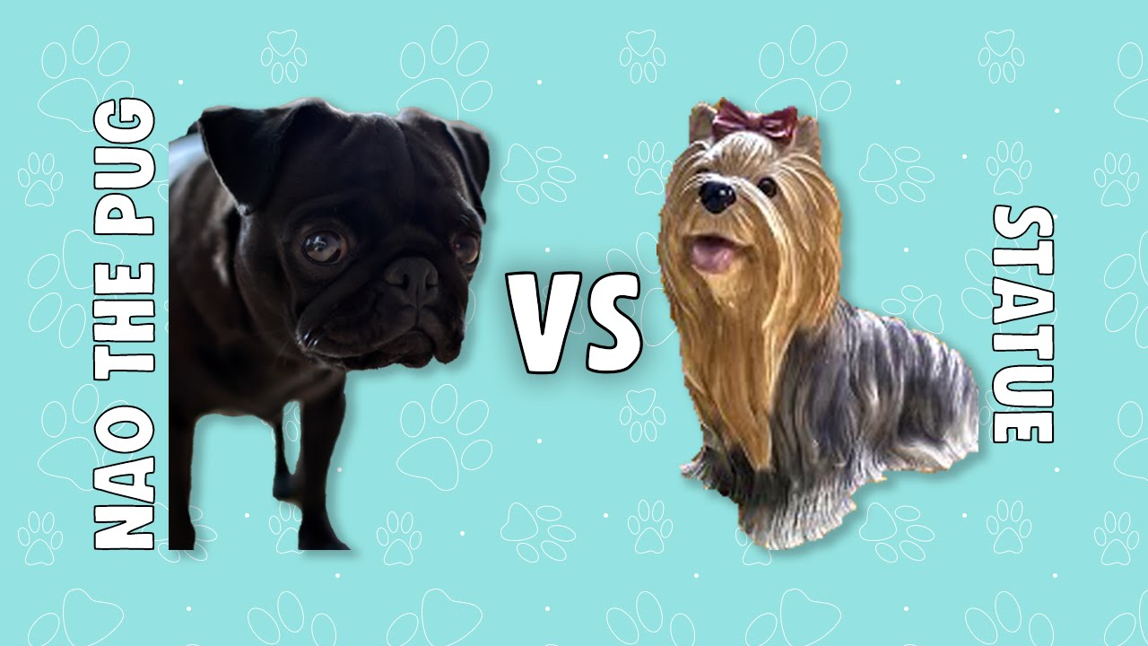 Nao, a fearless 2-year-old black pug, goes into attack mode when his home gets invaded by a small Yorkshire Terrier statue.