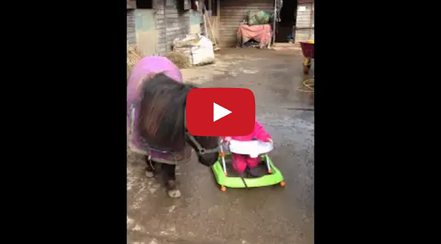 Baby Lucie takes her little Shetland pony friend on an adventure around the stables (with help from a baby walker).