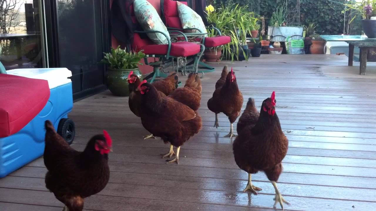 Missy the 7-year-old hen and her lady friends look adorable as they run around chasing after blueberries on a woman’s backyard deck.