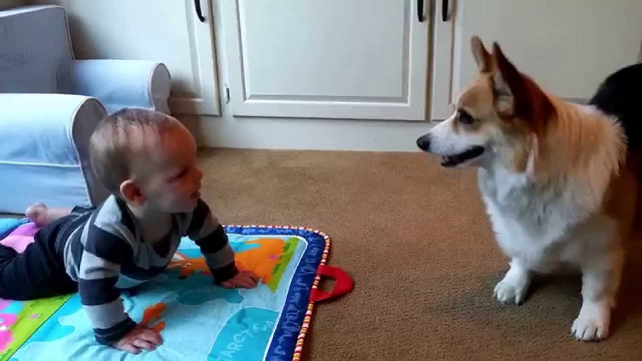 Tucker the corgi desperately wants his human baby sibling, Beau, to play with him.