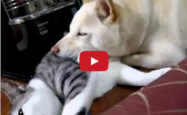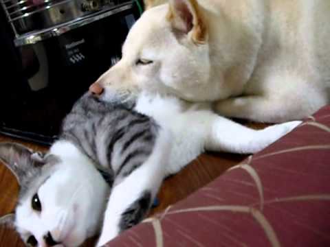 A shiba inu dog uses his feline housemate’s belly as a comfy pillow while taking a nap in front of a warm heater.