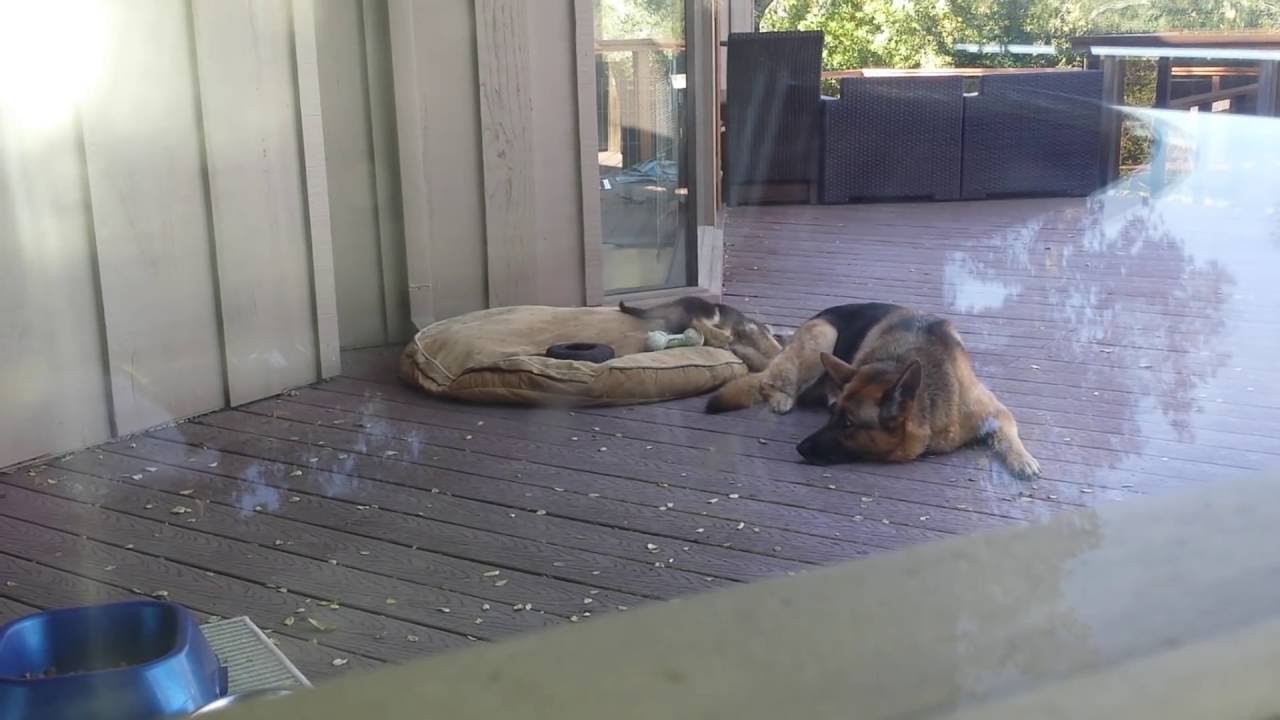 When it’s time for her to stop playing and take a nap, Kali the German shepherd puppy gets gently nudged back to her bed by her adopted German shepherd mom.