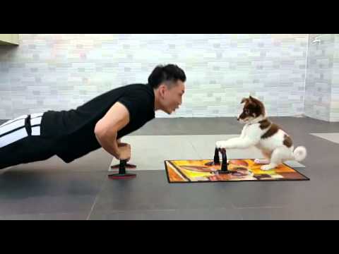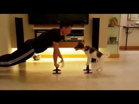 Eric Ko, a dog trainer at the Dogaroo Dog Training Center in Kowloon, Hong Kong, does a set of push-ups with his smart puppy, Teeny.