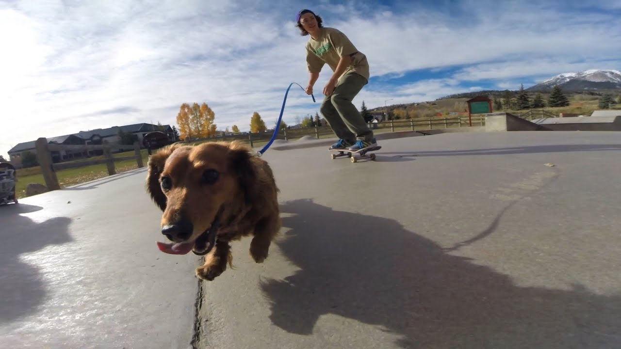 Calloway the long-haired dachshund goes on a skateboarding adventure with his human, Tylor Berreth, to the skatepark in Silverthrone, Colorado.