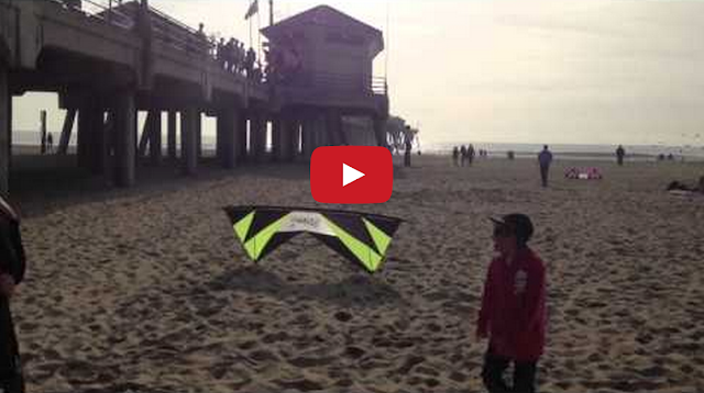 A boy gets hilariously outmaneuvered by a stunt kite on a beach in Huntington Beach, California.
