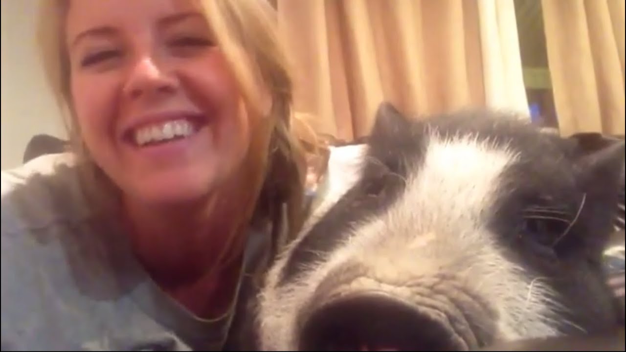 Virginia the pig adorably grumbles sounds of disapproval when her human tries to cuddle her.