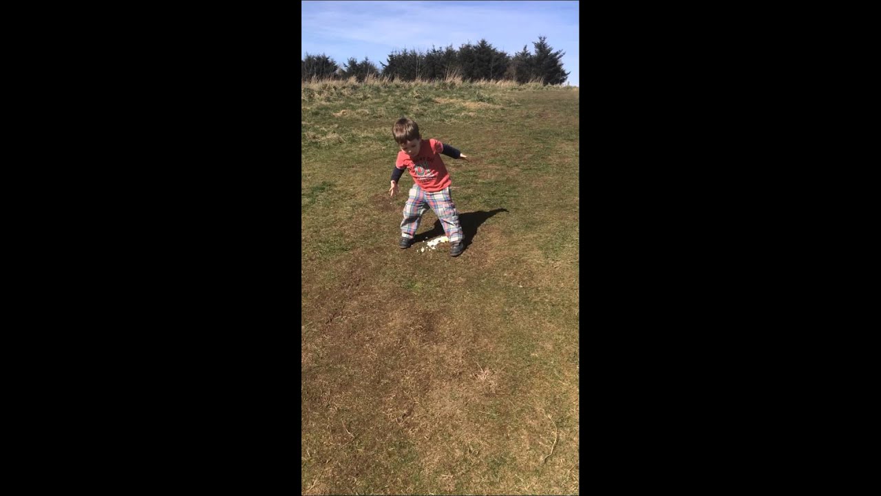 A little boy has an unfortunate misstep while Easter egg rolling with his dad and older brother.