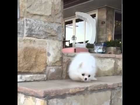 Pearl the fluffy white Pomeranian has an embarrassing moment while excitedly running down the steps in her backyard (don’t worry, she wasn’t injured).