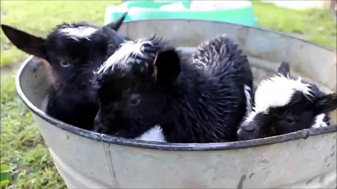 These newborn triplet pygmy goats look stylish and adorable in their tiny sweaters, which help keep them warm and cozy on chilly evenings.