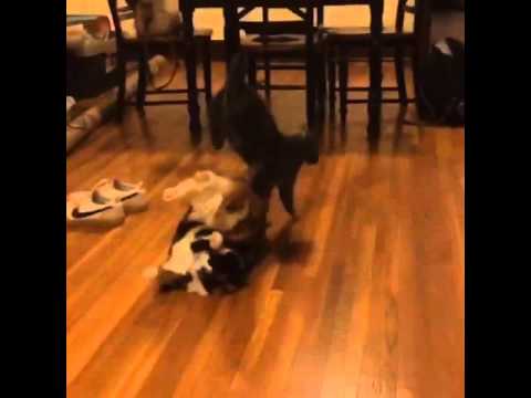 Juni the cat uses an awesome ninja-like flipping kick move to evade an ambush pounce attack from his feline housemate.