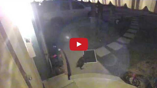 A outdoor security camera captures footage of an angry cat smashing his way through a screen-covered window to tell another cat to get off his lawn.