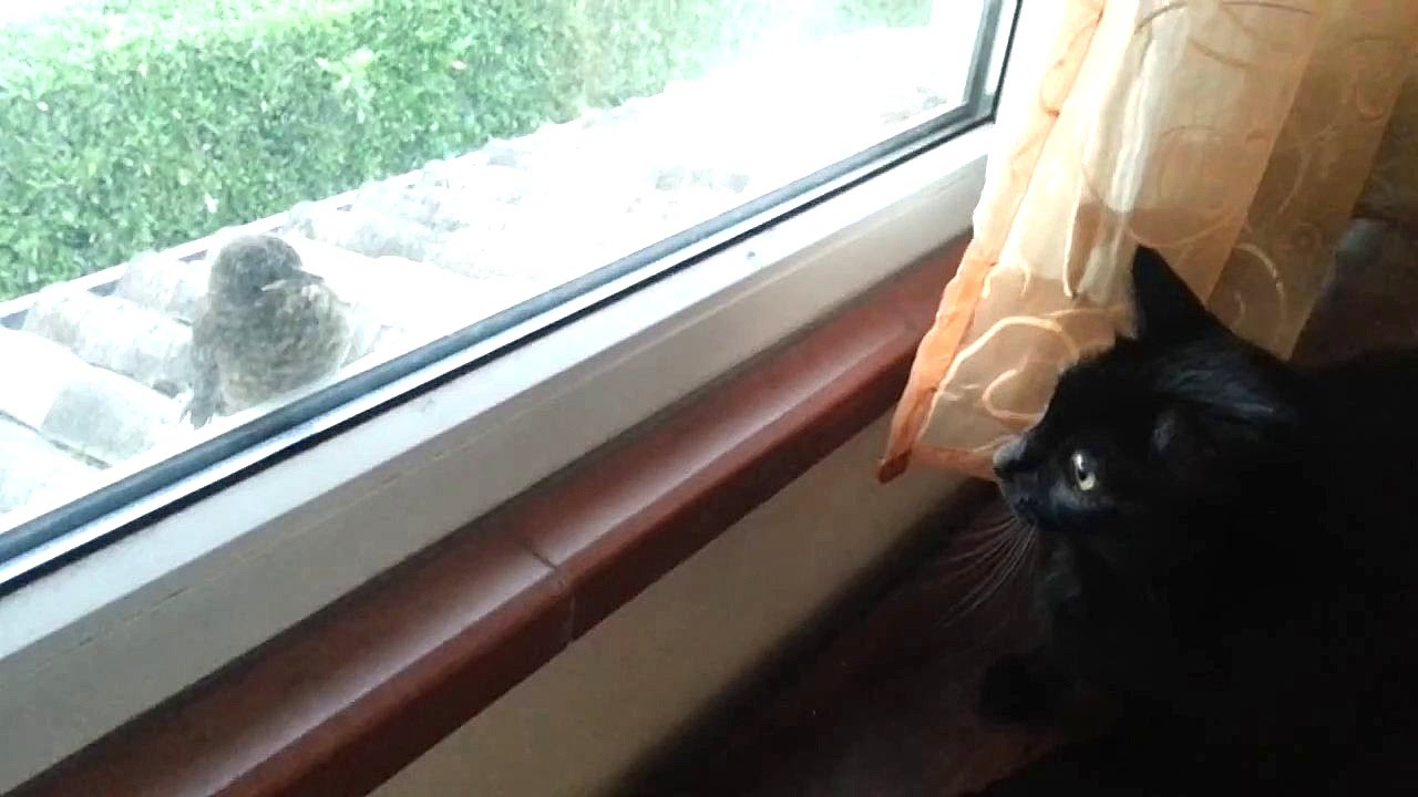 A cute black cat fails to intimidate a fearless little bird who’s hanging out on the other side of a closed window.