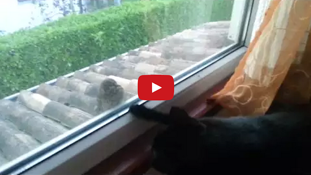 A cute black cat fails to intimidate a fearless little bird who’s hanging out on the other side of a closed window.