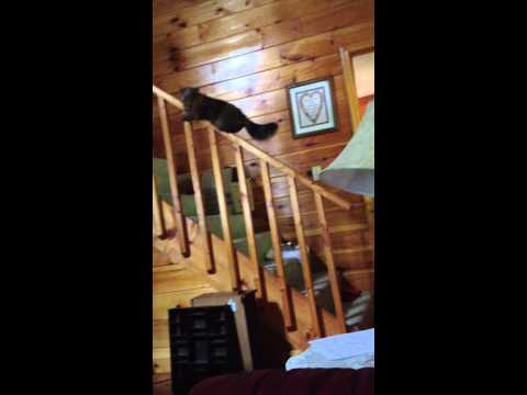 Heather Etheridge’s daredevil of a cat has decided that sliding down the banister is a much more fun and efficient way to come down stairs.