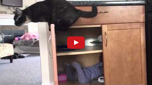 When a baby boy crawls into an open kitchen cabinet, his feline sibling jumps on the door, causing it to shut and trap him inside.