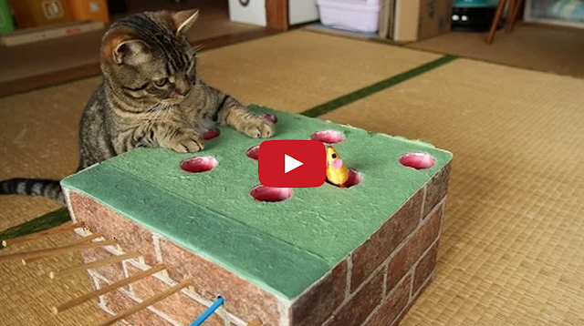Cute cats Rikimaru and Kikunosuke (the munchkin) have fun playing with a mini whack-a-mouse game that their human built for them from scratch.