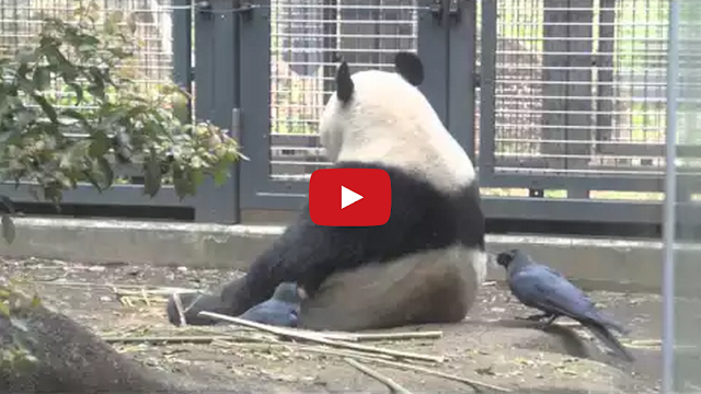 A chubby panda bear from Ueno Zoo in Tokyo, Japan provides and endless source of nest material for a couple of sneaky crows.