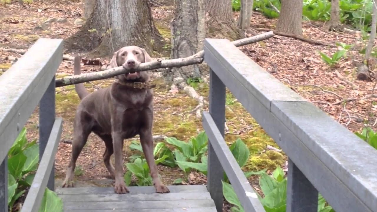 Dog Struggles to Get Giant Stick Across Narrow Bridge