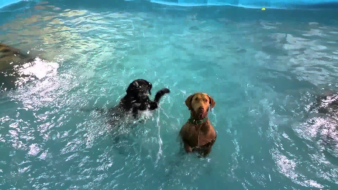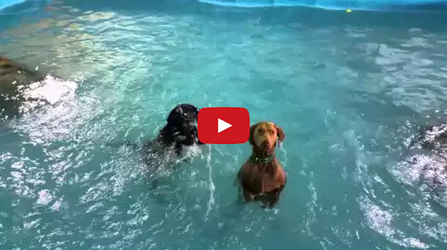A black lab who hasn’t quite mastered the art of swimming clumsily splashes his way over to his chocolate lab friend before realizing the pool is shallow enough for him to stand up. These lucky dogs are spending the day at the Happy Tails Dog Resort in Norfolk, Virginia.