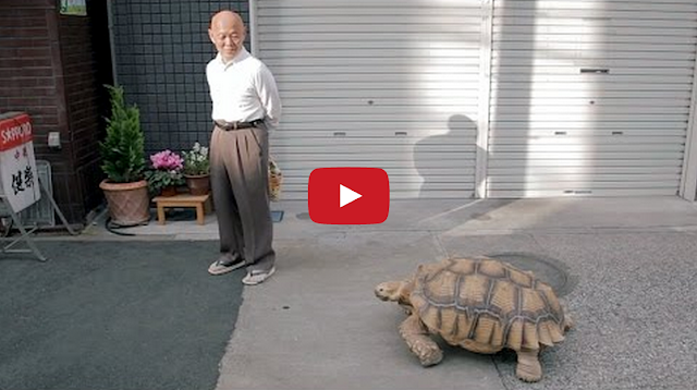 Funeral director Mitani Hisao from Tokyo, Japan attracts a lot of attention when he patiently takes his pet African spurred tortoise, named Bon-chan, for long walks around the neighborhood.